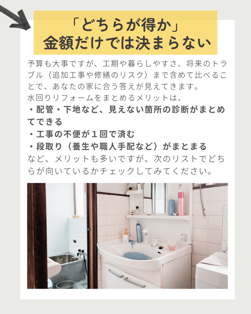水回り4点の“得・損”を分けるのは、設備の値段より 配管や下地をどこまで更新するか です。