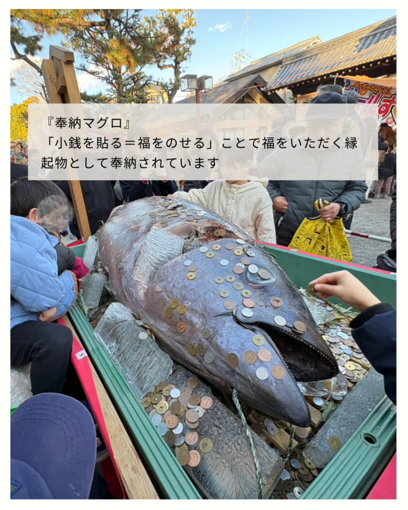 屋台もにぎやかで、お魚の縁起物(小銭を貼っていくやつ)も迫力満点。
