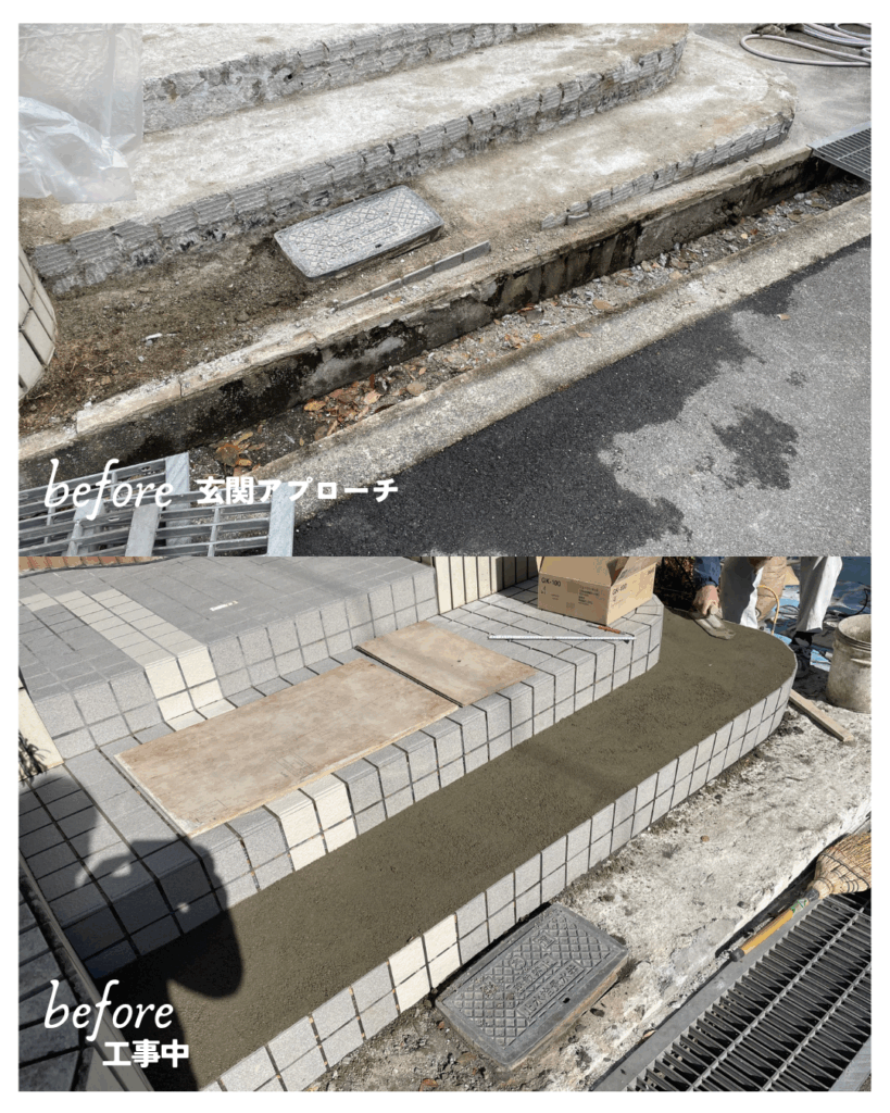 長年の使用で傷みや割れが目立っていた玄関階段は、タイルを貼り替えて新しく仕上げました。段差の形も整い、毎日の出入りがより安全に。見た目も明るくなり、玄関まわりの印象がすっきりしました。