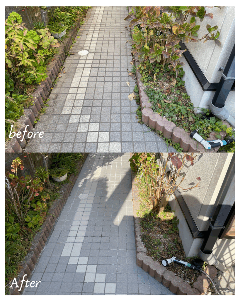 アプローチの小道も補修を行いました。現状のタイルを気に入っておられたため、同様のタイルを選んで貼り直し。雰囲気を変えずに、安心して歩ける仕上がりとなりました。