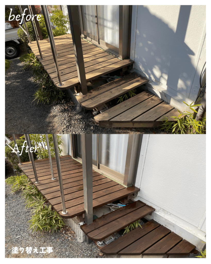 デッキは塗り替えを行い、木材を保護しながら落ち着いた雰囲気になりました。特に雨があたる部分は傷みが出やすいため、防水効果のある塗装で数年毎に保護しておくと長持ちします。