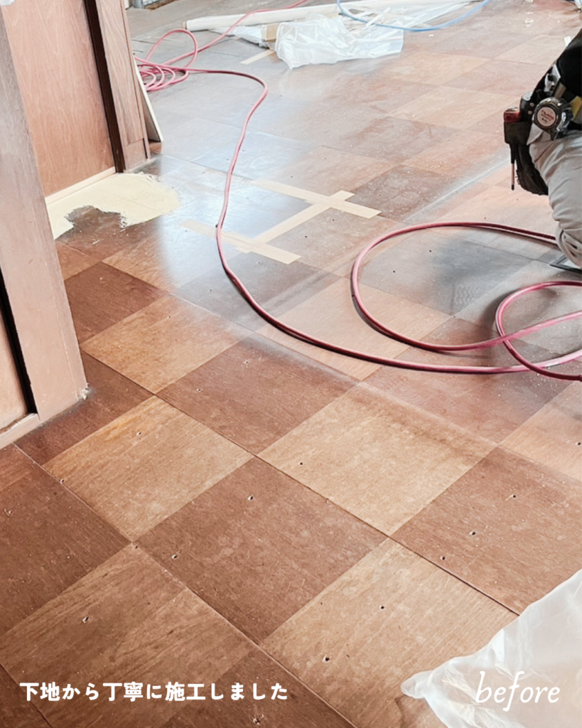 今回のフロア工事では、下地も傷んでいたことから、下地から丁寧にやり直して施工しました。